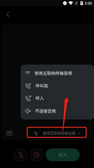 点击下图所示位置,可选择开启或关闭音频设备,或更换音频接收方式
