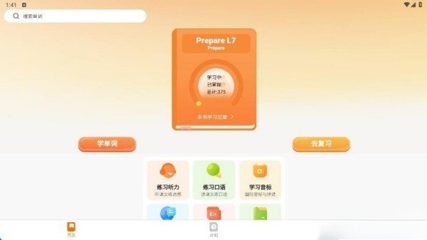 2. 软件首页为用户配备了学单词、去复习等功能,同时还提供口语、听力、音标等练习服务。