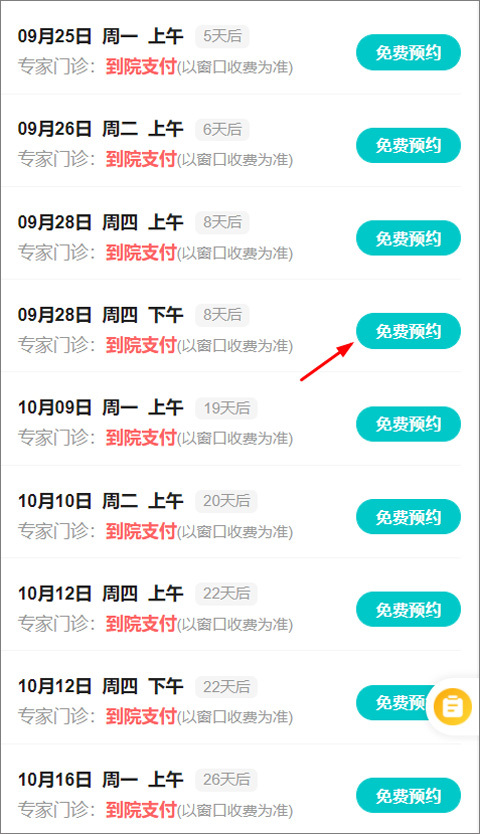 3、用户选定科室后进入医生列表页面,既可以选择专家医生进行挂号,也能选择普通医生挂号,点击对应医生右侧的“预约”按钮即可。