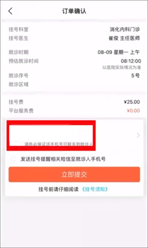 5、确认挂号订单后,需添加就诊人相关信息,输入有效的联系方式,最后点击提交缴费按钮,即可完成预约。