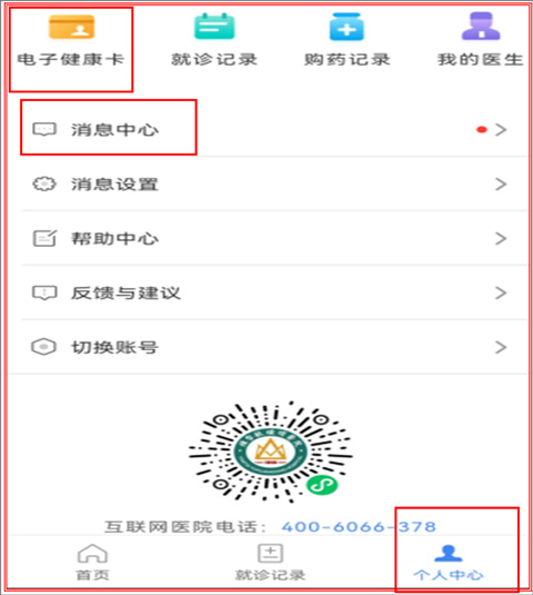 首先进入“个人中心”申请电子健康卡、绑定院内卡并在线建档,该功能支持添加8位就诊人,便于为多位家人办理就诊相关业务。