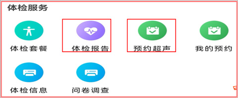体检服务涵盖“体检套餐、体检报告、超声预约、我的预约、体检信息、问卷调查”等功能模块。