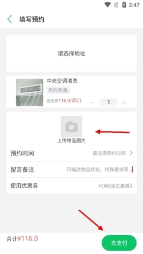 3、选定上门服务地址,上传待清理区域的图片后,点击支付按钮完成操作即可。