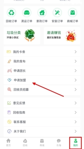 1、点击“我的”页面,下划到“申请加盟”。