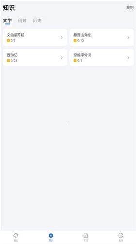 3、点击“知识”栏目,还能提前了解文学、科普、历史等相关知识。