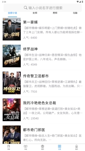 3、海量小说:汇聚海量小说资源,图书分类涵盖奇幻灵异、武侠修仙、校园言情、校花总裁、网游竞技、后宫穿越、历史人文、军事科技、两性生活等众多作品。