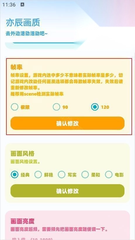 3、在首页往下滑找到【帧率】模块,选择120帧,点击确认修改即可。