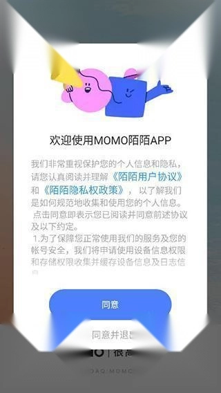 1、安装本站提供的MOMO陌陌最新版本,打开软件后需同意用户协议;