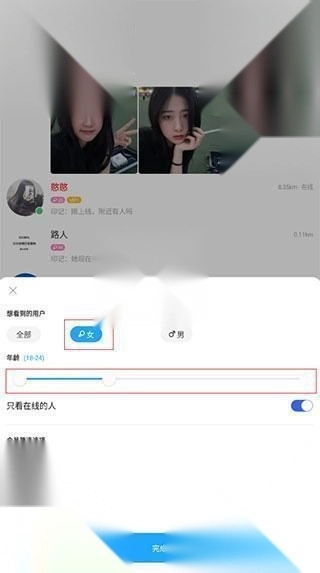 根据右上角手动筛选,你可以设置只看女生以及年龄。
