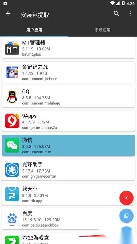4、长按想要提取的应用,点击右下角底部的图标就能完成提取操作了。