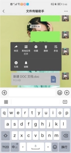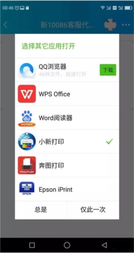 3、当软件与打印机成功连接后,我们就能打印微信或QQ里的文件了,操作方式很简单,只需在微信或QQ中找到收到的文件,然后选择“用其他应用打开”即可。