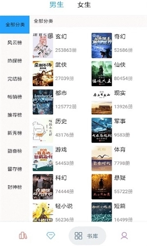 1、在男生、女生这两大分类之下,还包含了玄幻、武侠、仙侠、军事、历史等海量细分品类,为读者提供精准且全方位的分类指引。