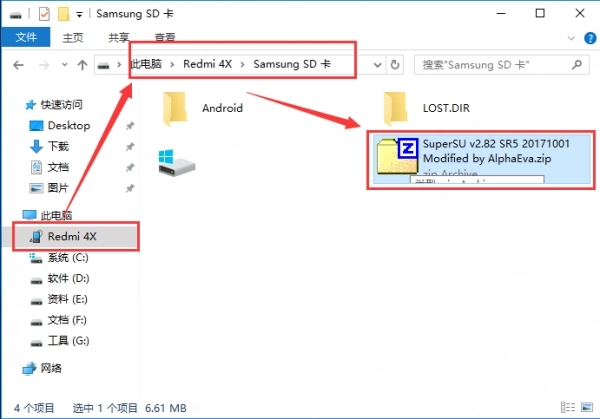 关于SuperSU卡刷包的操作步骤:请把可用的SuperSU卡刷包复制到手机存储的根目录当中。