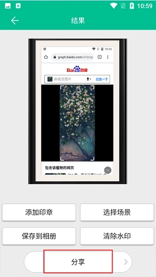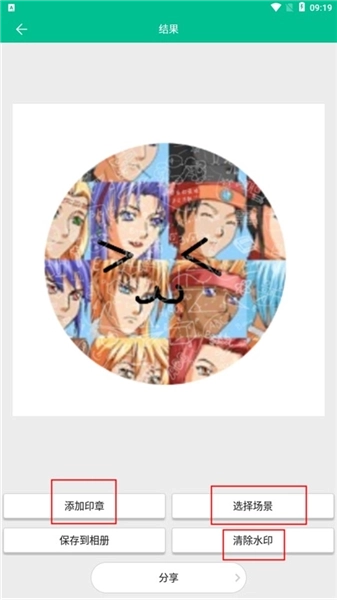 3、编辑完成后,点击右上角的“完成”按钮,系统会保存图片并跳转至保存与分享界面。在此界面,用户既可以将作品保存至相册,也能分享至微信或QQ,此外还能根据个人喜好对成果进行添加印章、文字或场景等操作。