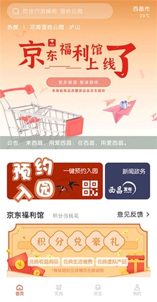 1、进入软件【首页】后,我们可以看到预约入园、新闻政务、京东福利馆等常用功能。