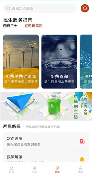 3、在【民生】页面,还能看到大量民生服务指南,像电费缴费、水费查询、西昌医保等都包含在内。