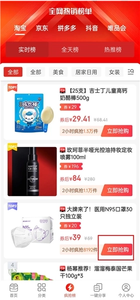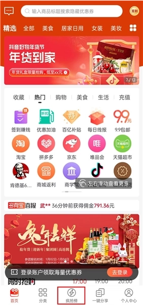 1、启动软件后,能看到界面上陈列着各类购物平台,接着我们点击底部导航栏中的疯抢榜选项。