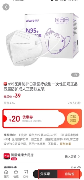 3、先领优惠券再点击自省购,分享还可以赚取佣金
