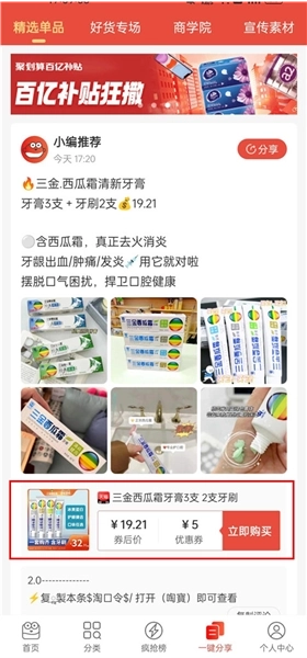 支持在线分享优质商品素材,当他人点击你分享的链接完成购买时,你就能获得相应奖励。