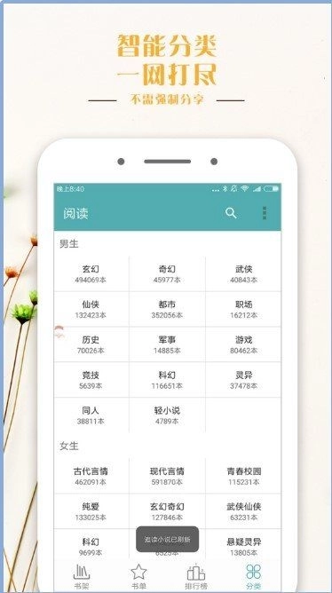4、为你提供更丰富的小说选择,并依据男生女生不同的阅读喜好进行分类。