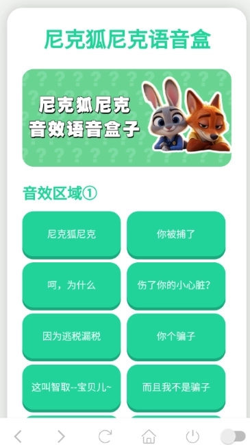 尼克狐尼克语音盒是一款依据《疯狂动物城》角色语音打造的播放软件,里面收录了海量经典语音音频,像“尼克狐尼克”“你被捕了”“呵,为什么”“伤了你的小心脏?”这类热门语音全都包含在内,十分有趣。这款语音盒界面简洁大方,操作也极为简便,点击就能播放,用来调动氛围再合适不过了!