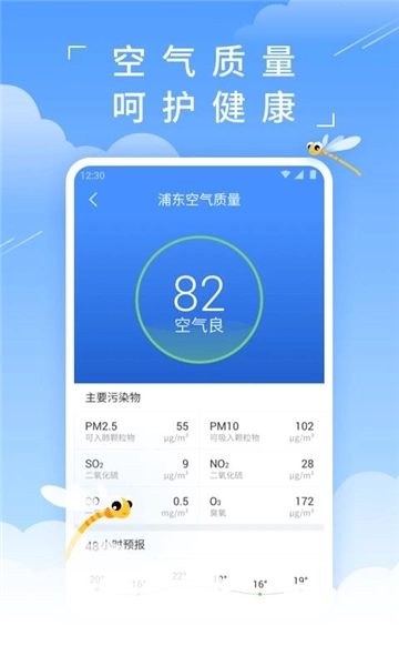3、实时空气质量监测:可提供未来48小时以及15天的空气质量预报;同时实时更新空气质量、PM2.5等相关指数的预报信息。