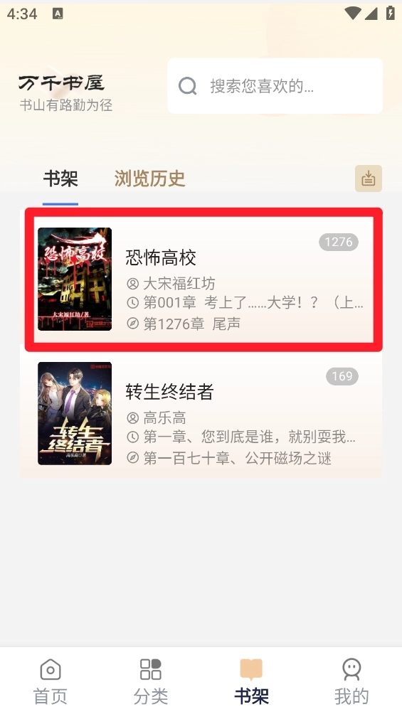 3、回到主页后进入书架板块,就能查看已添加的目标小说。