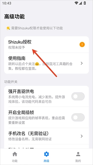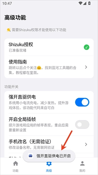 2、而像强开直驱供电功能需要用户使用Shizuku授权激活使用