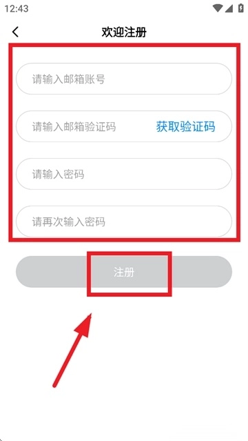 输入邮箱,邮箱验证码,输入密码,点击注册即可