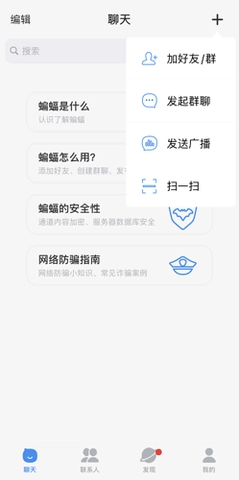 在蝙蝠的聊天页面右上角找到那个带加号的按钮,点击后在弹出的选项里选择添加好友或群组的功能入口。