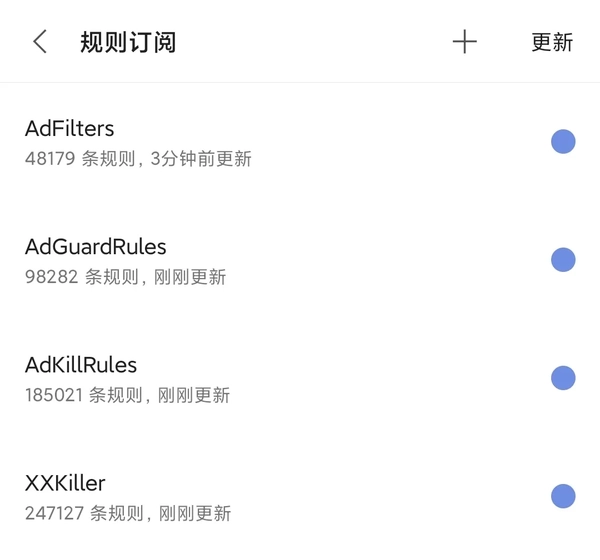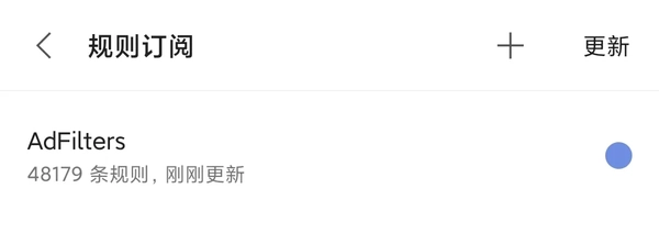 若想更新相关功能,可进入系统设置界面找到更新选项并点击操作。目前系统的拦截规则数量已达四万八千余条,但这一量级仍有提升空间。建议查看文末提供的订阅源信息,通过添加指定地址即可导入更多规则。
