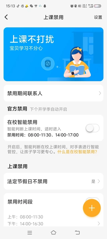 上课禁用模式——锁定娱乐功能,仅保留时间显示与SOS紧急求助功能,助力专注学习。