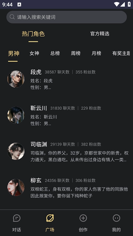 1. 大量预设角色供选,各角色标签清晰,助力用户迅速匹配心仪对象。题材丰富,包含现代、古风、奇幻等多种类型。
