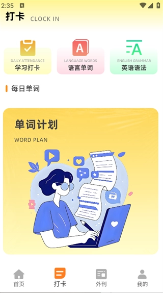 点击页面下方的“打卡”按钮,就能看到学习打卡、语言单词、英语语法等功能模块。