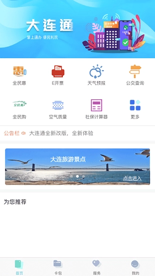 大连本地综合行业集成服务,涵盖生活服务类的出行、行业相关服务以及账单支付,同时还包括医疗社保对接、公积金业务办理和市民年卡等服务内容。