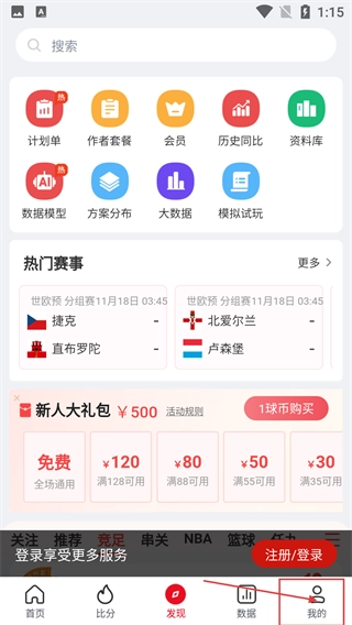 在体育数据类的发现页面,点击右下角“我的”,进入个人中心页面。