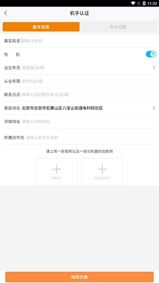 信息认证涵盖【基本信息】与【作业范围】两个主要部分,完成这两项认证后,农机手就能顺利完成注册。
