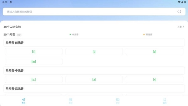 安装完成进入首页后,即可使用音标分类与学习功能,方便用户快速了解音标知识,并能在线练习发音。