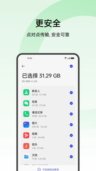 支持一键转移联系人、通话记录、照片、视频等常用信息,更换手机时无需担忧数据丢失问题。