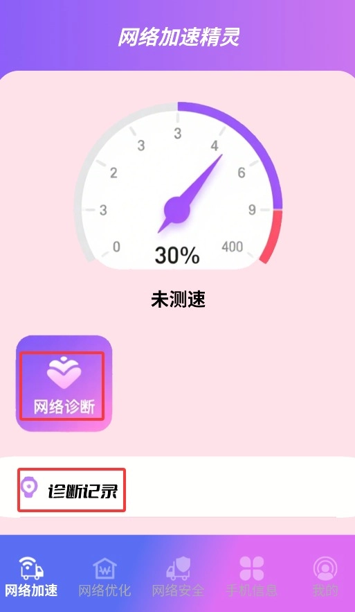 在网络加速板块,可点击网络诊断功能检测连接状态并查看历史记录。