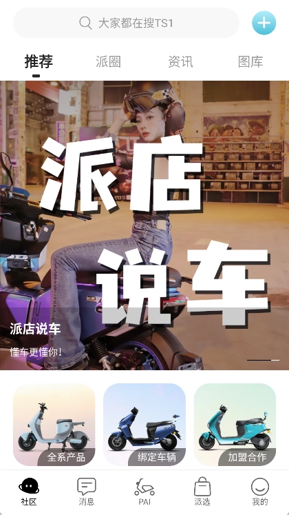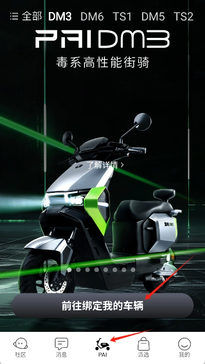 添加电动车的操作步骤如下:首先在底部导航栏找到“PAI”选项并点击,接着点击“前往绑定我的车辆”即可。