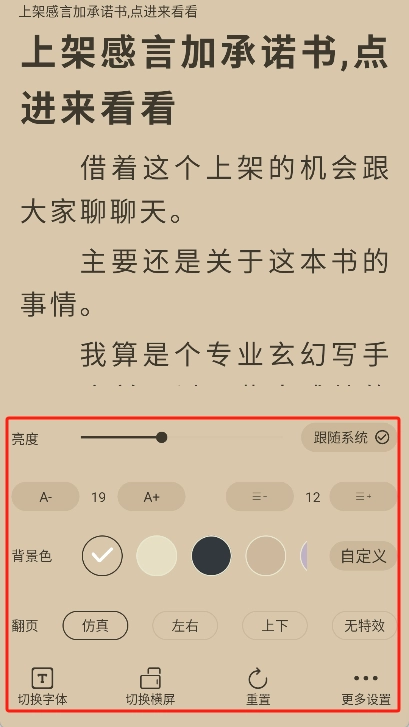 用户还能在阅读界面进行翻页模式切换、字体大小调整以及背景颜色亮度调节等操作。