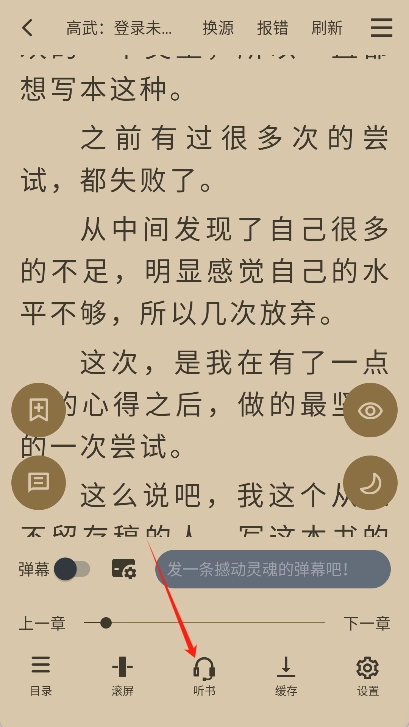听书功能的使用方法如下:在阅读界面轻点屏幕中间位置,会弹出功能菜单,此时在底部中间区域找到标有【听书】字样的按钮,点击该按钮就能启动听书功能。