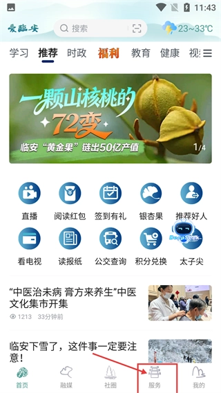 进入【爱临安】首页后,点击底部导航栏的【服务】入口,就能查看【直播】-【阅读红包】等功能,从而快速进入生活服务板块。