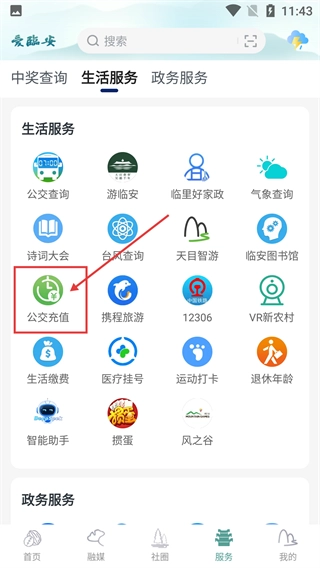 在【爱临安】的【服务】页面,切换至【生活服务】板块,找到并点击【公交充值】选项,即可进入充值操作界面。
