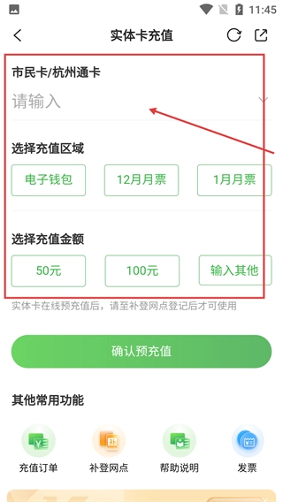 进入【实体卡充值】页面后,先在【市民卡/杭州通卡】输入框填写卡号,接着选择【充值区域】和【充值金额】,为预充值操作做好准备。