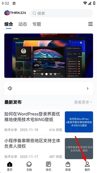 1、在技术宅首页,点击右下角的“我的”选项,即可进入个人中心页面。