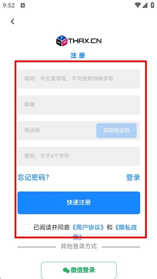 4、进入注册页面后,依次填写所需信息、勾选相关协议,随后点击“快速注册”按钮,即可完成账号注册流程。
