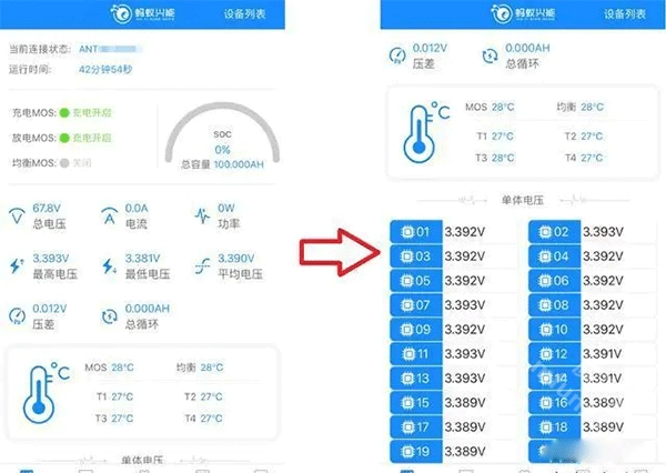 蓝牙直连后,可查看单体电压、电压差、充放电功率、循环次数等相关参数。