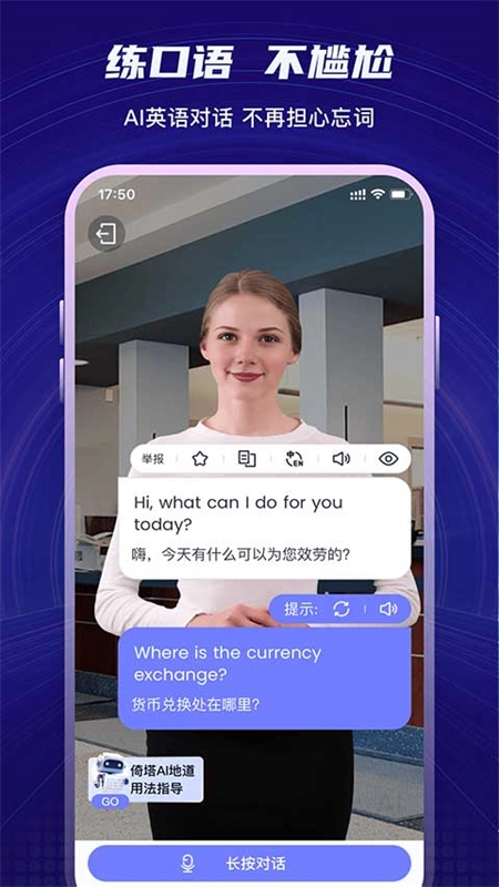 1、英语数字人“倚塔”,依托全景虚拟场景,为你提供随时随地的口语陪练服务。 2、在虚拟现实场景中开展对话,通过探索世界的角色扮演,开启一段迷人的英语学习之旅。